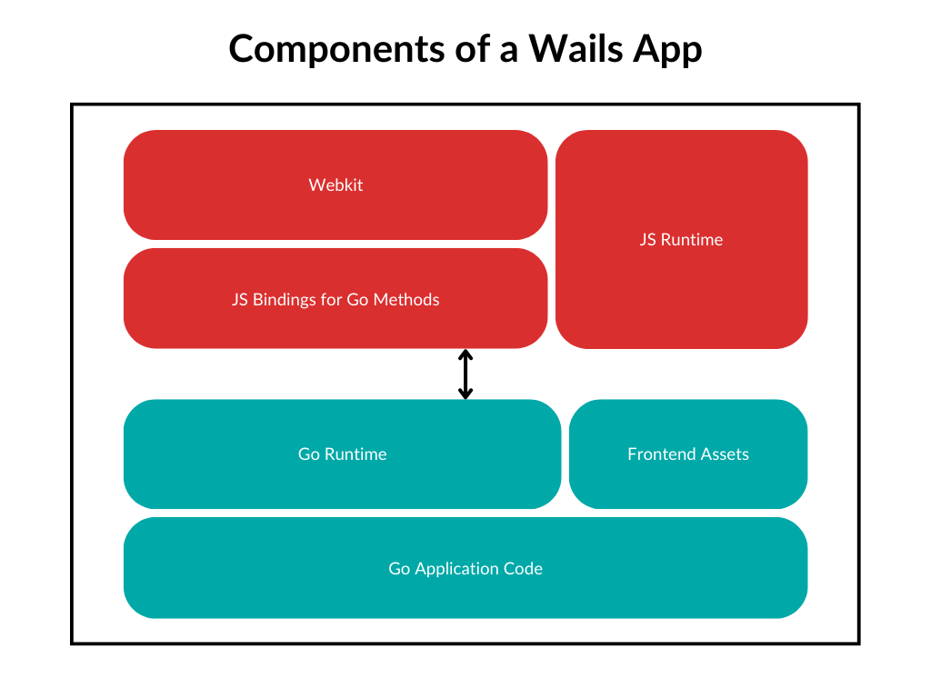 Wailsは、webkitフロントエンドを備えた、何の変哲もないGoアプリです。 アプリ全体のうちGoの部分は、アプリのコードと、ウィンドウ制御などの便利な機能を提供するランタイムライブラリで構成されています。 フロントエンドはwebkitウィンドウであり、フロンドエンドアセットをウィンドウ上に表示します。 フロントエンドからも、JavaScriptでランタイムライブラリを呼び出すことができます。 そして最終的に、Goのメソッドはフロントエンドにバインドされ、ローカルのJavaScriptメソッドであるかのように、フロントエンドから呼び出すことができます。