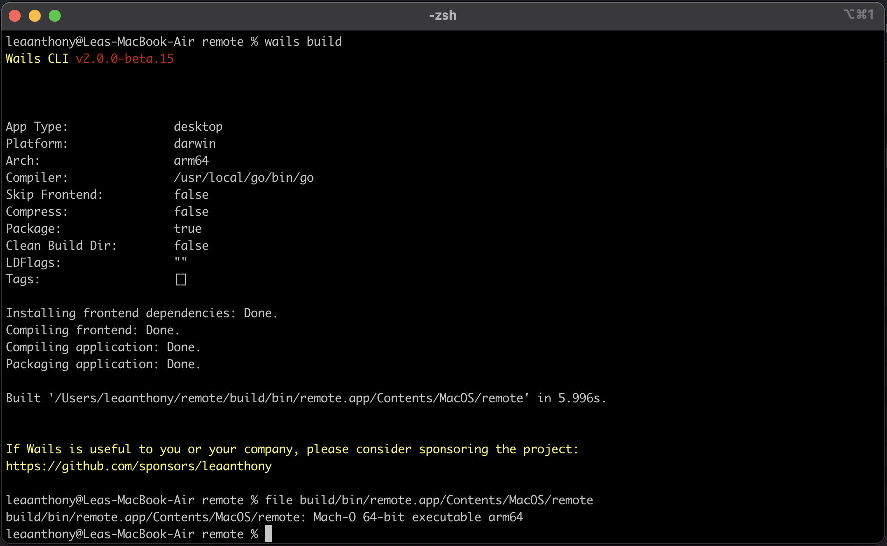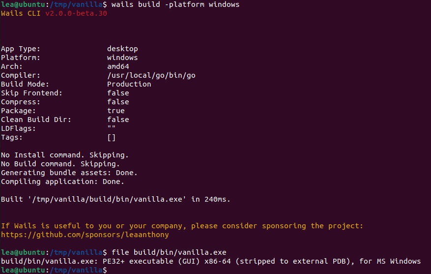 A peça que falta no quebra-cabeça da construção são as operações atómicas no processo de construção, como geração, compactação e empacotamento de ícones. Para exigir um monte de ferramentas externas não seria uma ótima experiência para o desenvolvedor. Para resolver isso, a CLI do Wails fornecerá todos esses recursos como parte da CLI. Isso significa que as compilações ainda funcionam como esperado, sem ferramenta externa extra, no entanto você pode substituir qualquer passo da compilação por qualquer ferramenta que você goste.